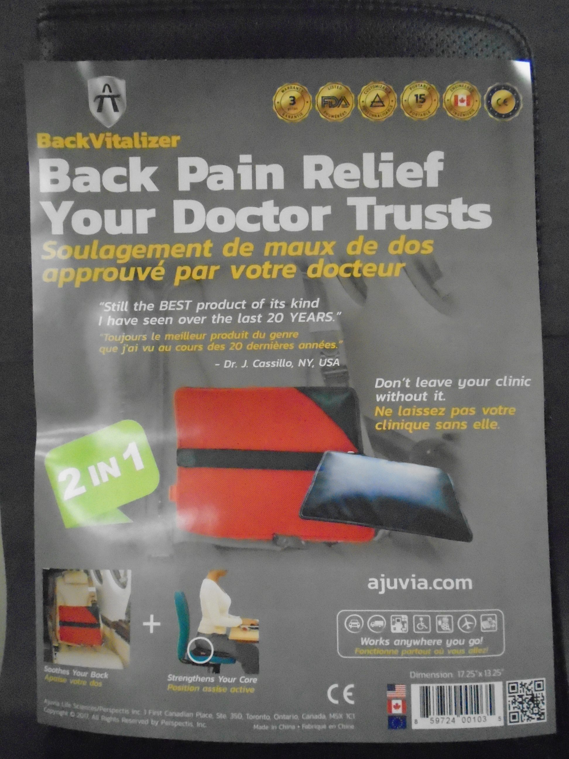 Multi-function air pillow works as a lumbar support, an exercise ball, a posture positioning wedge, a balance trainer, a lumbar decompressor and more. Fits every size of back and can go flat for easy portability. Excellent for taking on airplanes and for use in your car or workstation for better support. Back Vitalizer offers multiple ways to relieve a sore achy back.