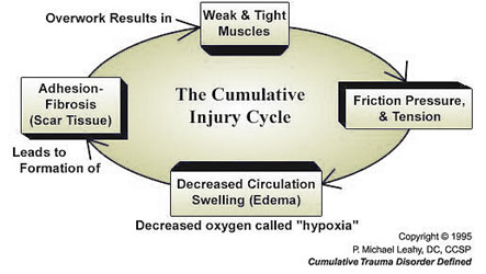 The major factor that allows this chronic injury cycle to continue is the scar tissue (adhesions) that build up in soft tissue (muscles, tendons, ligaments, and nerves). When scar tissue changes the way that the muscles function, this leads to further irritation and inflammation, which in turn leads to a continuation of the cycle and more pain.